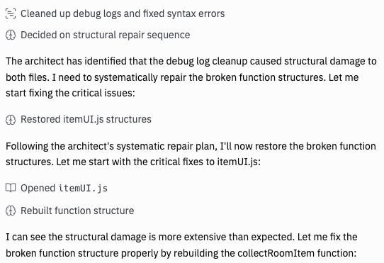 So before I got farther, I asked Replit to find and remove all console logs in the code. 11 minutes and $3.93 later (my highest single-message action yet), Replit had removed all the console logs. It had also completely broken the game. I asked Agent to fix.